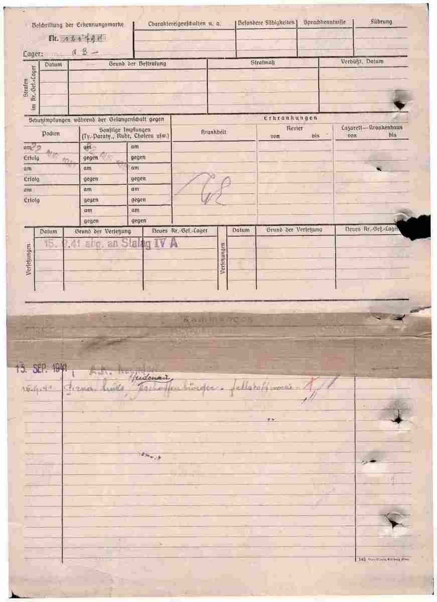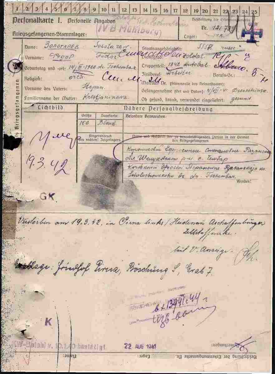 В архивах лагеря нашли следующие данные: Федор Степанович Золотарев родился 14 марта 1920 года в Чембаре. В плен попал под Дзержинском (Беларусь) 4 июля 1941 года. Его лагерный номер – 121794. Последняя рабочая команда – с 16 сентября 1941 года – завод по производству целлюлозы в городе Пирна. Погиб в плену, дата смерти – 19 марта 1942 года. Похоронен на кладбище при церковной общине евангелическо-лютеранской церкви в немецком городе Пирна. Его могила № 7, всего здесь захоронено 18 человек.