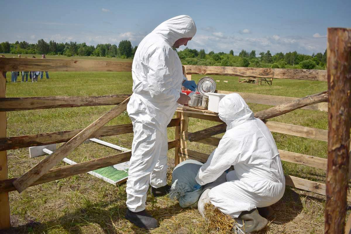Через час в хозяйство выехали ветеринарные специалисты для проведения эпизоотологического обследования. На месте учений они пошагово провели все необходимые ветеринарные действия по ликвидации и локализации очага чумы. Они отработали порядок отбора, упаковки, упаковки, доставки проб биологического и патологического материала в ветеринарную лабораторию; развертывание мобильного ветеринарно-санитарного пропускника и контрольно-пропускных пунктов с практическим использованием различных образцов дезинфекционной техники, дезинфектантов и средств индивидуальной защиты; провели в эпизоотическом очаге условный бескровный убой и уничтожение животных.