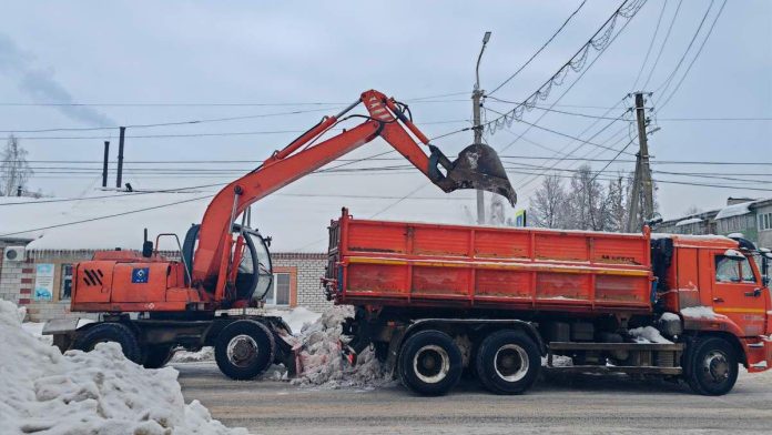 Работники Шиловского МУПТЭС убирают снежные завалы с улиц и площадей районного центра.